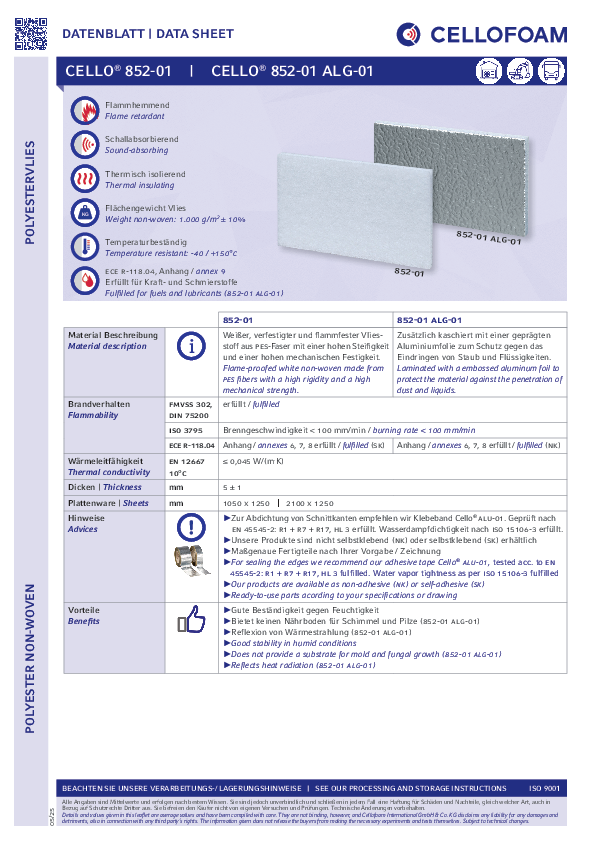Flame-proofed white non-woven made from polyester fibers. Cello® 852-01 scores with exceptional rigidity and mechanical strength as well as excellent temperature resistance.