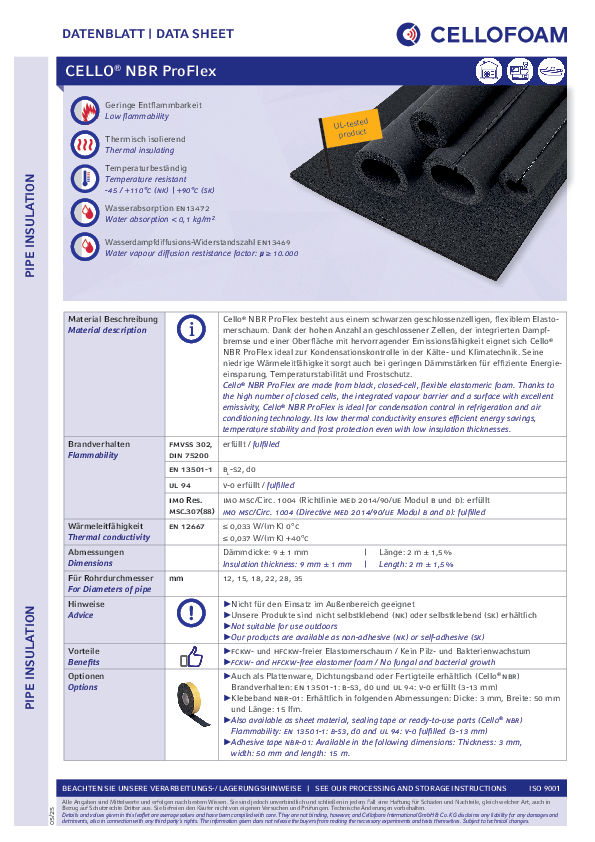 Cello® NBR ProFlex are made from black, closed-cell, flexible elastomeric foam. Thanks to the high number of closed cells, the integrated vapour barrier and a surface with excellent emissivity, Cello® NBR ProFlex is ideal for condensation control in refrigeration and air conditioning technology. Its low thermal conductivity ensures efficient energy savings, temperature stability and frost protection even with low insulation thicknesses.Product details