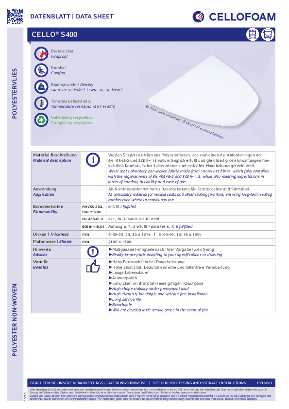 Cello® S400 is a white seat upholstery non-woven fabric made from 100% PET fibres, which fully complies with the requirements of EN 45545-2 and ECE R-118, while also meeting expectations in terms of comfort, durability and ease of use.